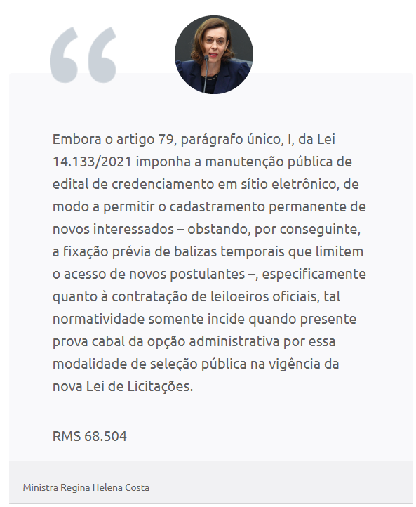 No julgamento do RMS 68.504, a Primeira Turma definiu que a administração pública só é obrigada a divulgar edital de credenciamento de leiloeiros oficiais de forma permanente na internet após a vigência da nova Lei de Licitações. Para o colegiado, a obrigatoriedade só existe após a administração optar formalmente pelo sistema de credenciamento, procedimento que não era expressamente previsto na Lei 8.666/1993.