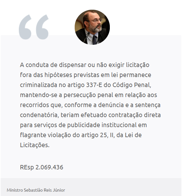 No mesmo julgamento, o ministro observou que o crime de dispensa indevida de licitação, antes previsto no artigo 89 da Lei 8.666/1993, passou a ser regido pelo artigo 337-E do Código Penal, após a edição da Lei 14.133/2021. Segundo ele, esses dispositivos são, na verdade, normas penais em branco, cujo conteúdo depende de complementação das hipóteses legais de contratação direta, antes previstas nos artigos 24 e 25 da lei revogada e hoje disciplinadas nos artigos 74 e 75 da nova Lei de Licitações.