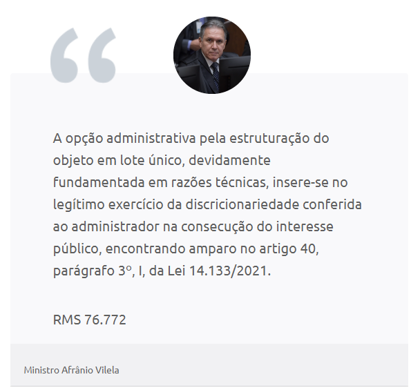 “Assim, em que pese o princípio do parcelamento nas licitações, inexiste ilegalidade na opção administrativa pela estruturação do objeto em lote único “, afirmou o ministro.