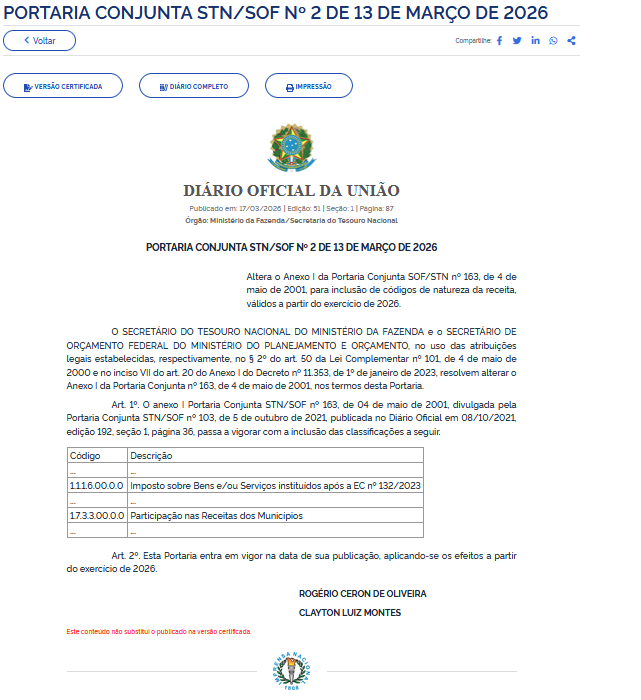 Foi publicada a Portaria Conjunta STN/SOF 2 no Diário Oficial da União (DOU) desta terça-feira, 17 de março, promovendo alterações na estrutura de classificação das receitas públicas, com efeitos já a partir do exercício de 2026.