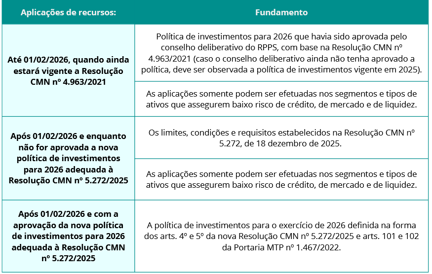 A Resolução CMN nº 5.272, de 18/12/2025, cuja vigência se iniciou em 2 de fevereiro de 2026, revogou a Resolução CMN nº 4.963, de 25/11/2021, e passou a estabelecer os princípios, parâmetros, limites, condições e requisitos para as aplicações de recursos dos RPPS.