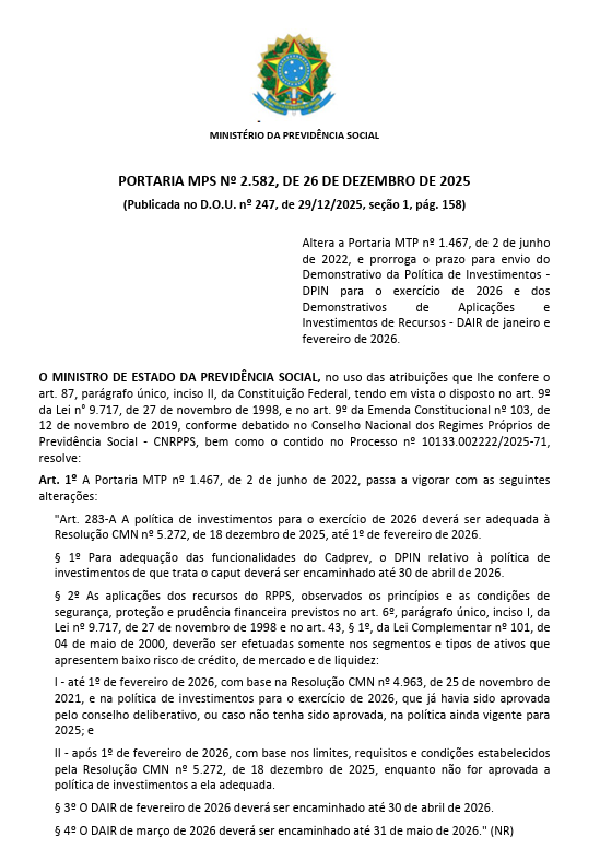 Em seguida, foi publicada a Portaria MTP nº 2.582/2025, de 26/12/2025, que incluiu o art. 283-A na Portaria MTP nº 1.467/2022 e buscou orientar os RPPS quanto às aplicações de recursos em 2026.