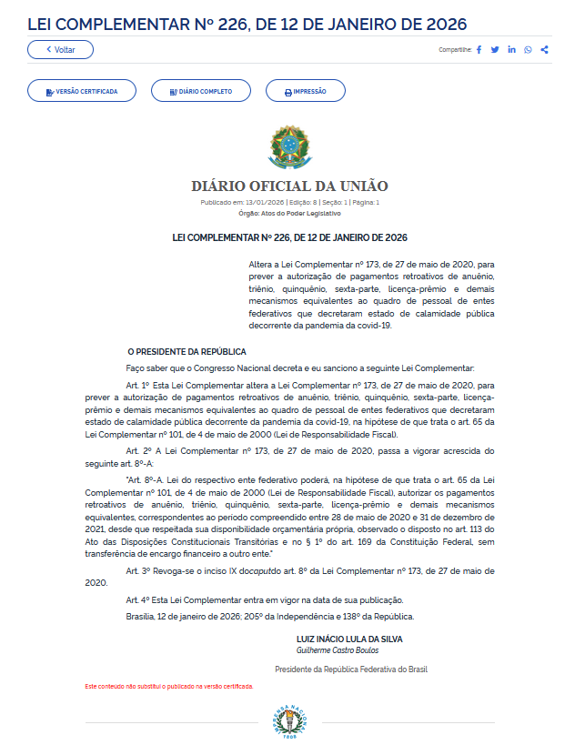 Foi sancionada pelo presidente Lula e publicada no Diário Oficial da União desta terça-feira (13) a Lei Complementar 226, que autoriza os estados, o Distrito Federal e os municípios a pagarem para servidores, retroativamente, direitos remuneratórios congelados durante a pandemia de covid-19. A lei é originada de proposta do Senado.