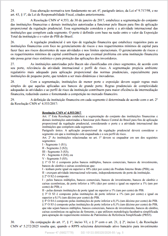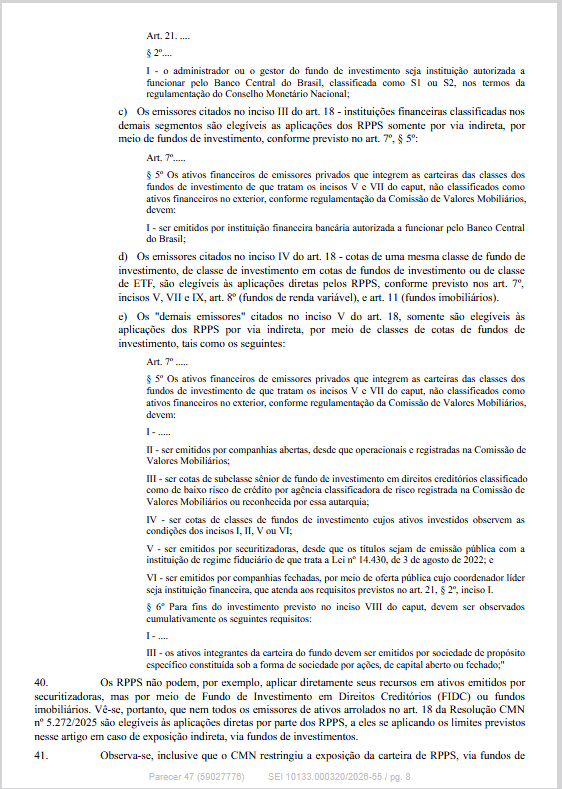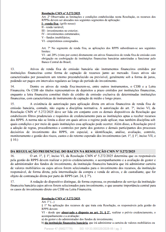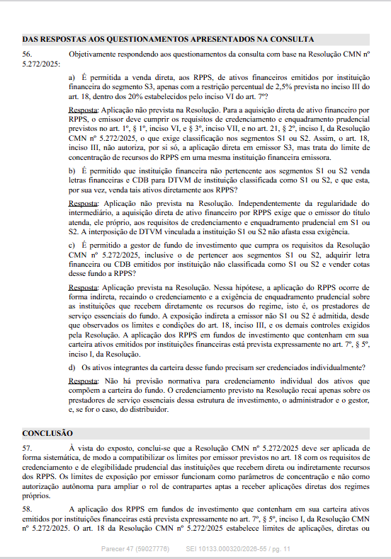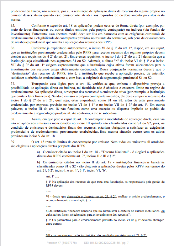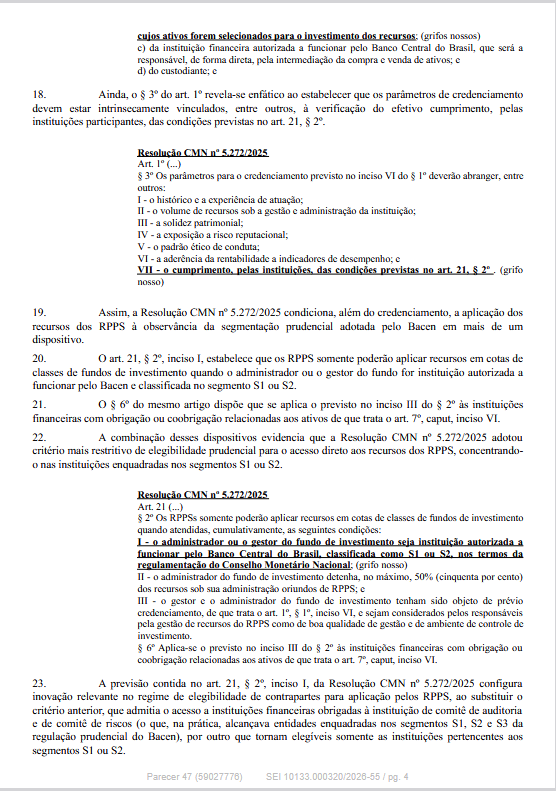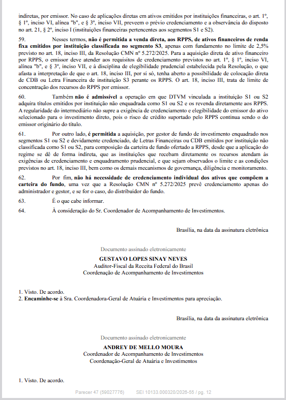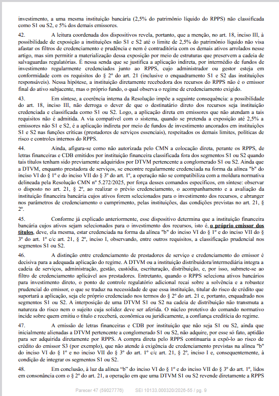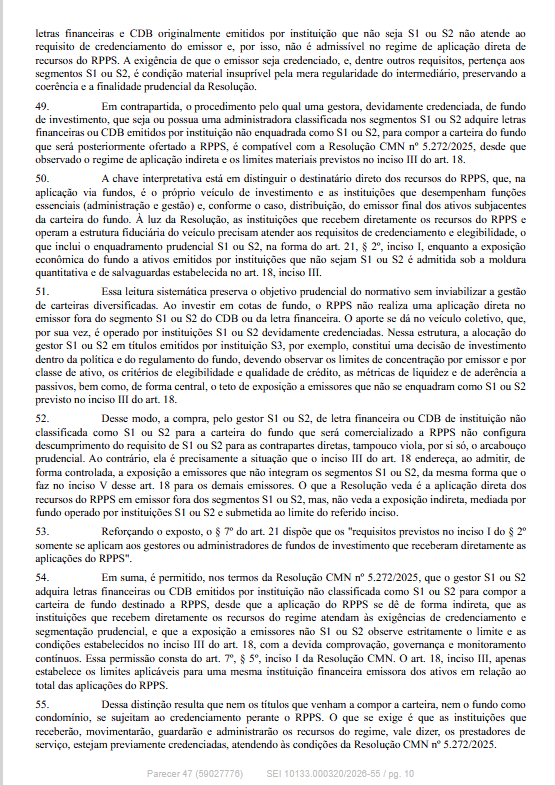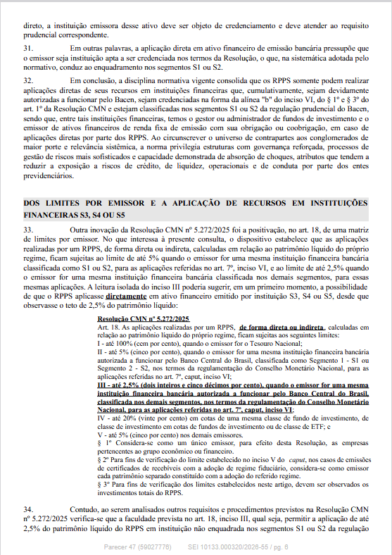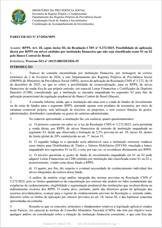 O Departamento dos Regimes Próprios de Previdência Social do Ministério da Previdência Social informa que publicou o Parecer SEI nº 47/2026/MPS, de 23/03/2026, que contém esclarecimentos e orientações acerca da impossibilidade de aplicação direta por RPPS em ativos emitidos por instituição financeira que não seja classificada como S1 ou S2 pelo Banco Central do Brasil.