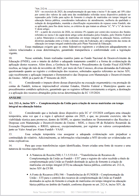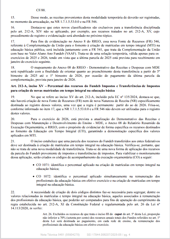 incluiu os incisos XIV e XV ao art. 212-A da Constituição Federal, dispondo sobre a destinação de recursos para ampliação de matrículas em Educação em Tempo Integral (ETI) no âmbito do Fundeb.