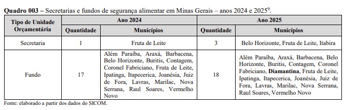 Além das secretarias, a equipe técnica identificou 18 Fundos Municipais de Segurança Alimentar em 2025, nas seguintes cidades: Além Paraíba, Araxá, Barbacena, Belo Horizonte, Buritis, Contagem, Coronel Fabriciano, Diamantina, Fruta de Leite, Ipatinga, Itapecerica, Joanésia, Juiz de Fora, Lavras, Marilac, Nova Serrana, Raul Soares e Vermelho Novo. Em 2024, eram 17, com exceção apenas de Diamantina, que entrou neste ano.